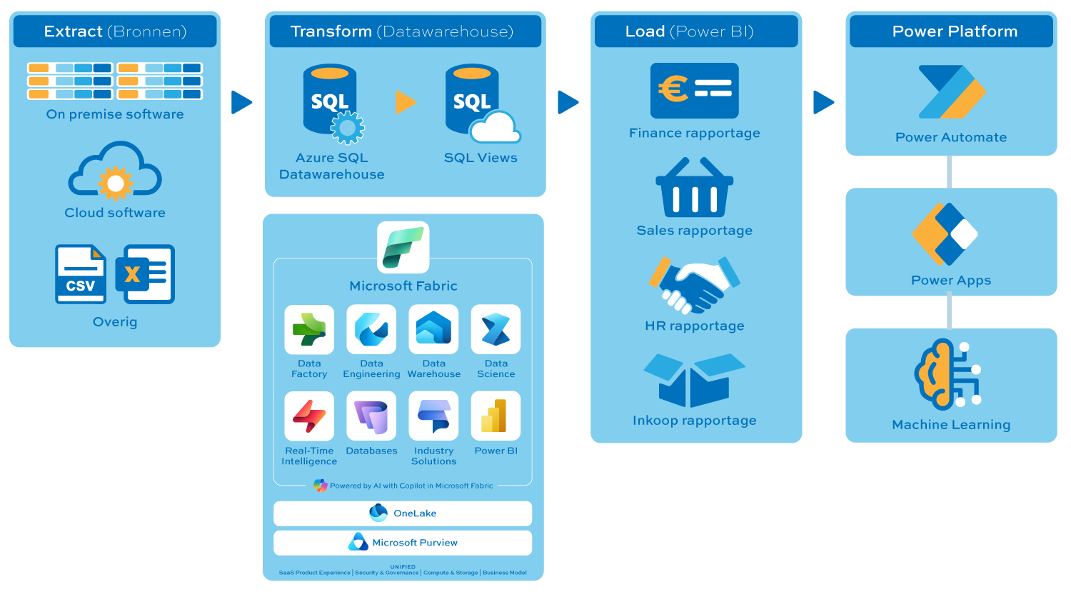 Hierbij gebruiken we Microsoft SQL Server, Azure Synapse, Lakehouse of Fabric Warehouse – afhankelijk van de schaal, complexiteit en noden van uw organisatie.